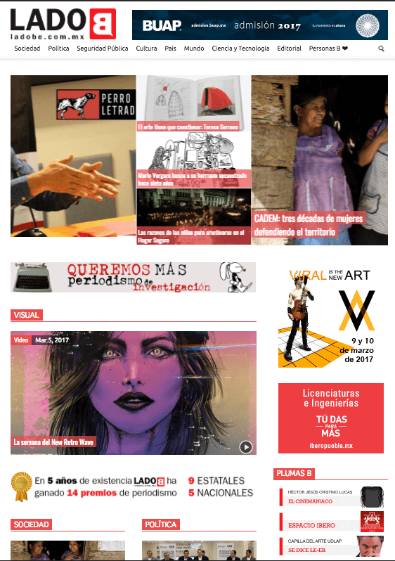 Lado B es un medio local, enfocado principalmente a contar e investigar la política, la economía y los temas sociales del estado de Puebla, en México. Existe desde 2011, es dirigido por Ernesto Aroche y Mely Arellano, y cuenta con un equipo base de seis editoras y reporteras, todas mujeres.