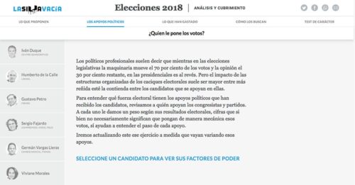 Para las elecciones colombianas del Senado y la Cámara de Representantes de marzo de 2018, el medio La Silla Vacía elaboró una herramienta para conocer los perfiles completos de los candidatos.