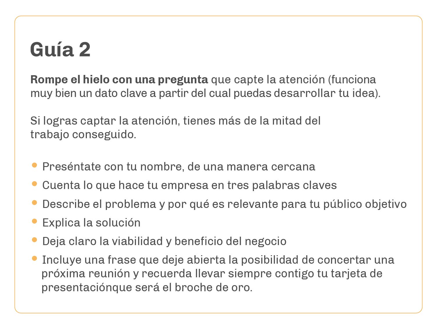 Pero un elevator pitch no es resumir en tan poco tiempo todo lo que hacemos. Al contrario, al reunirnos con alguien que podría aportar al proyecto en cuestión, es fundamental convencerlo de que nuestra idea es interesante para que quiera saber más al respecto.