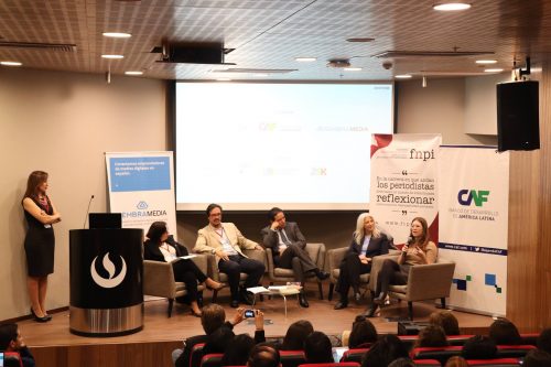 Jordy Melendez de Distintas Latitudes (México), Paulette Desormeaux de Red de Periodistas (Chile) y Fabiola Torres becaria de ICFJ y co-fundadora de Ojo Público (Perú).