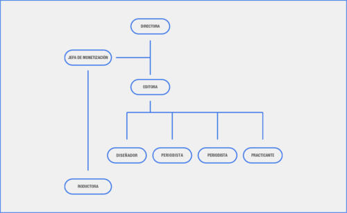 Consiste en graficar las áreas de la organización y describir cómo se relacionan y jerarquizan. Definir la estructura hace más fácil priorizar y desestimar roles. Puedes adentrarte en la sección de estructura de la Guía de herramientas para ordenar organizaciones periodísticas.