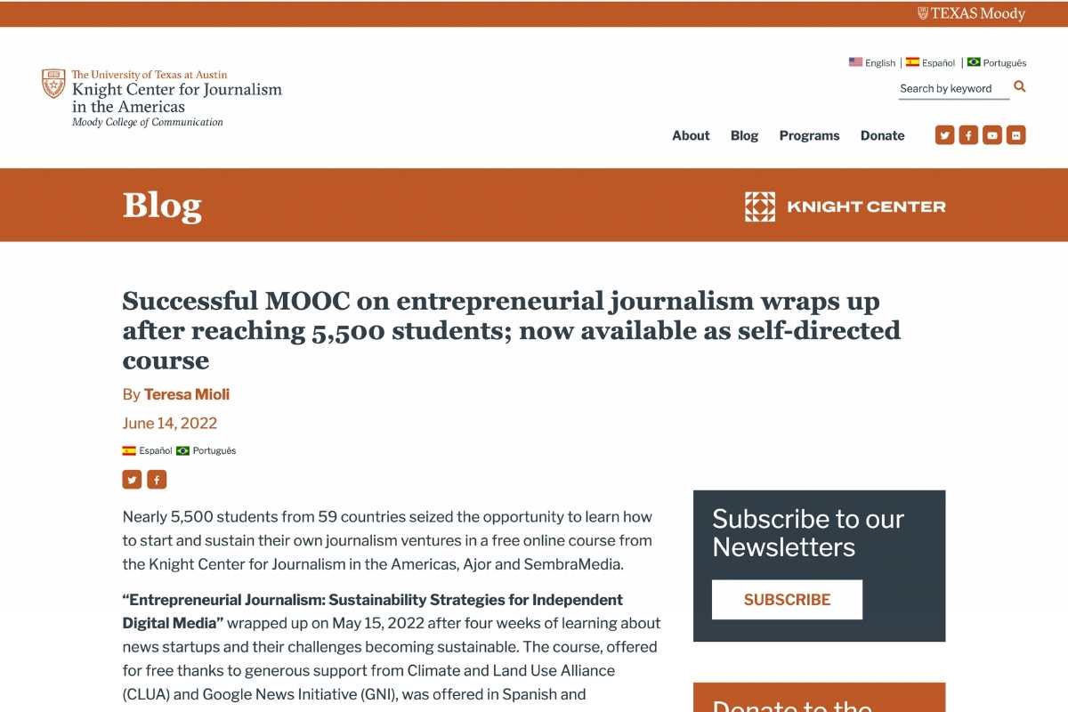 Successful MOOC on entrepreneurial journalism wraps up after reaching 5,500 students; now available as self-directed course