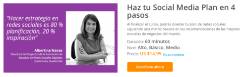 Las redes sociales, el sitio web, las aplicaciones móviles, la optimización de búsquedas y las plataformas de mensajería son algunos de los elementos que pueden conformar esta estrategia. Pero como dice Albertina Navas —consultora en estrategia de redes sociales— “los resultados dependen del conjunto, no de una sola plataforma”. En su clase Haz tu social media plan en 4 pasos, Albertina nos guía por ese sendero que no tiene una sola fórmula mágica pero que busca maximizar el impacto de lo que hacemos.