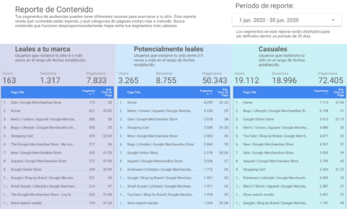 Al final del reporte hay una variante de esta página, para la cual cada segmento tiene dos tablas de contenido –una con filtros aplicados solo para ver el contenido por artículo, otra con filtros para ver todo menos el contenido de artículo. Esto puede ofrecer una visión mucho más profunda de cómo tus mejores usuarios utilizan tu sitio, pero requiere de un setup adicional, como se detalla en las instrucciones.