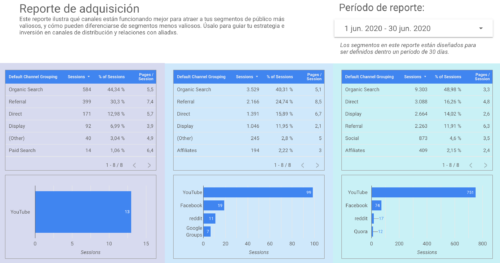 ¿Cómo encuentran el sitio tus mejores usuarios, y cómo refieren usuarios los canales individuales de distribución? Este reporte muestra cada segmento por Agrupación de Canales por Defecto de Google Analytics, redes sociales, y referidores.